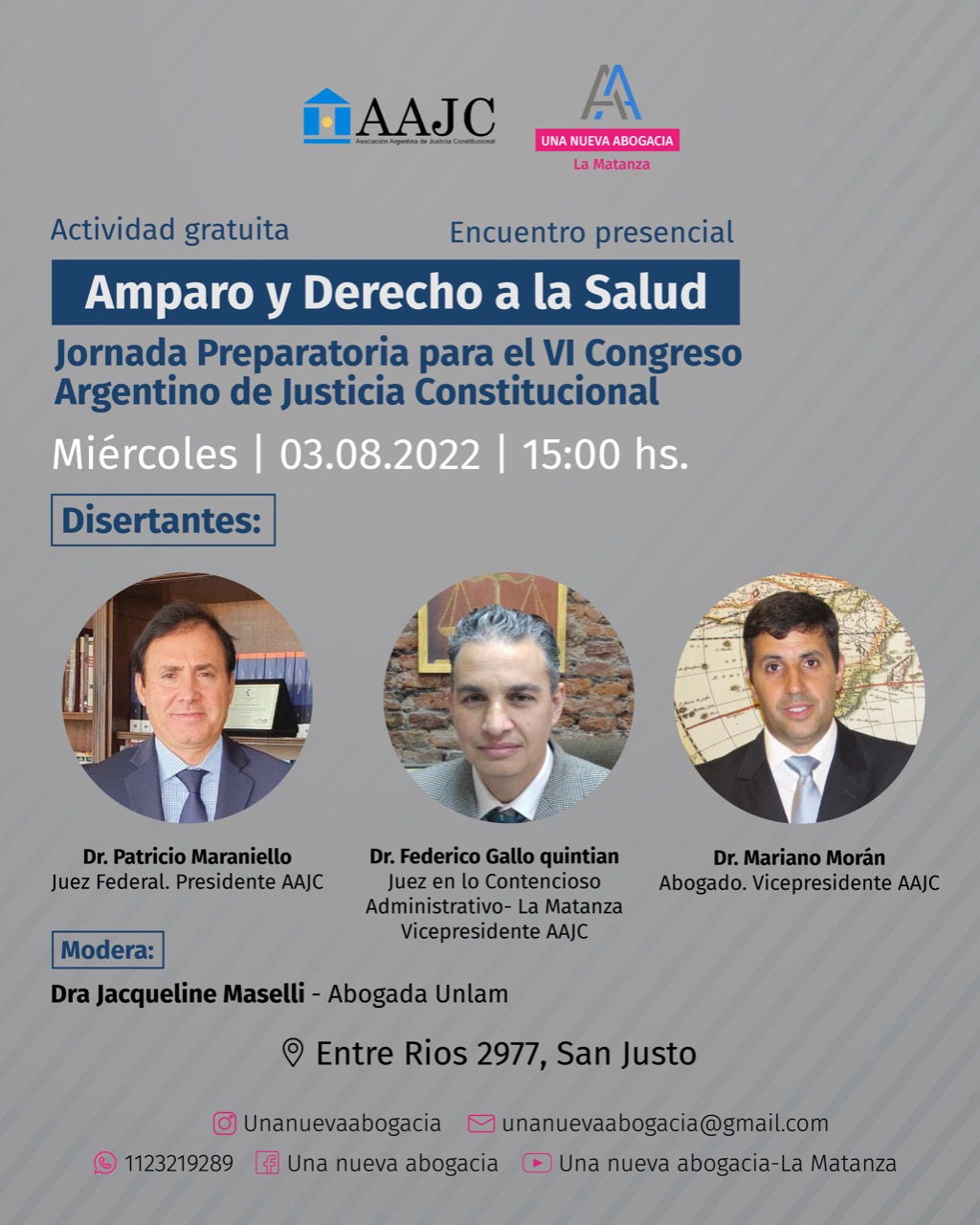 Estimados miembros de la comunidad académica, tengo el agrado de compartir con ustedes la Jornada Preparatoria para VI Congreso Argentino de Derecho Constitucional, la cual se llevará a cabo el día miércoles 3 de agosto a las 15.00 hs., de manera presencial en la calle Entre Ríos 2977 en la localidad de San Justo, Partido de La Matanza.