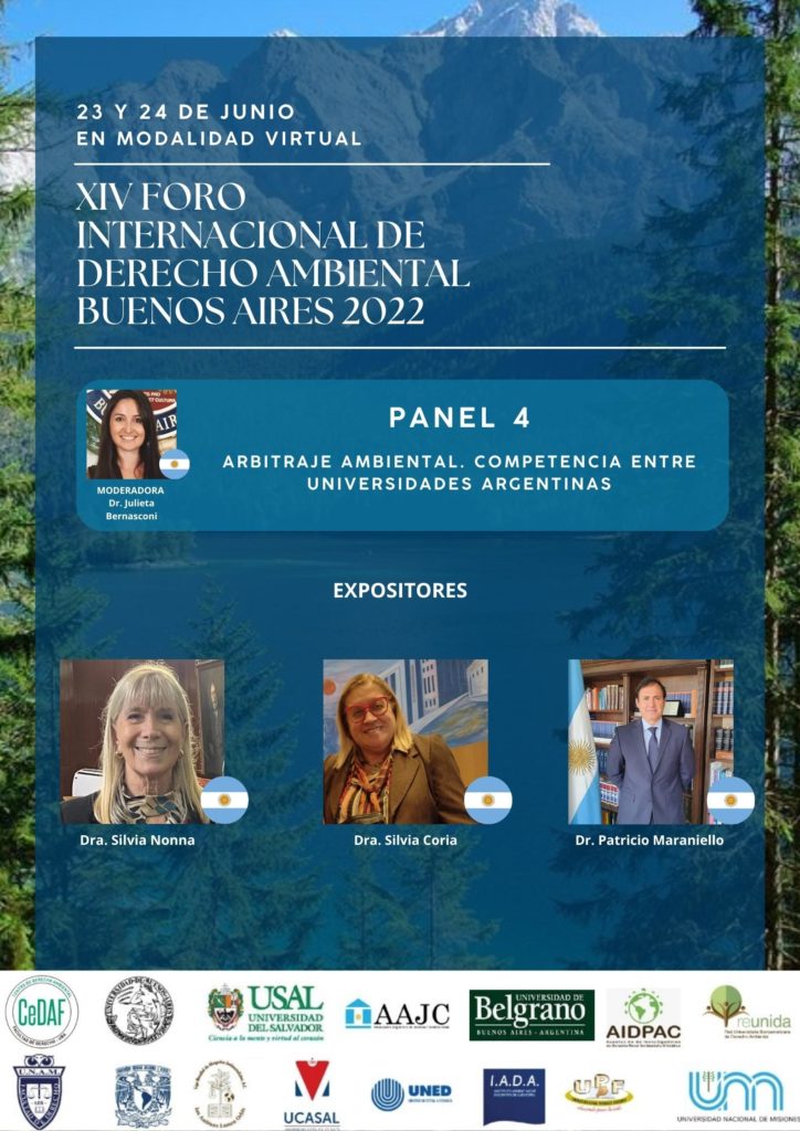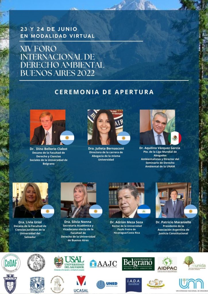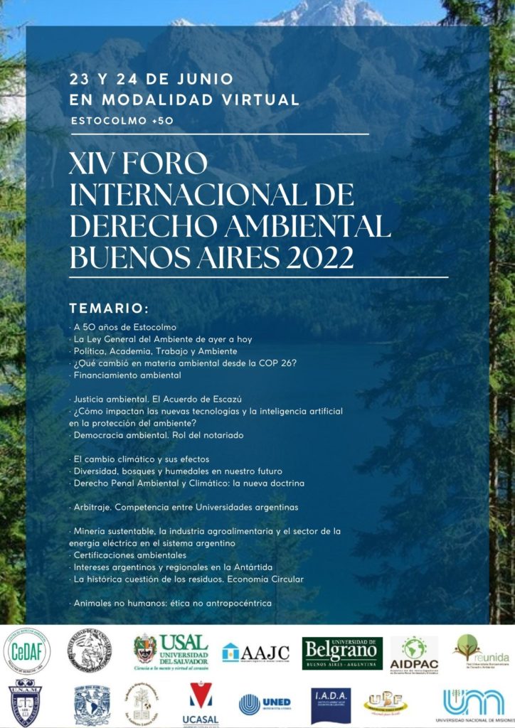 • El XIV Foro Internacional de Derecho Ambiental Buenos Aires 2022 es organizado por la Facultad De Derecho y Ciencias Sociales de la Universidad de Belgrano (Argentina) y la Asociación Argentina de Justicia Constitucional.